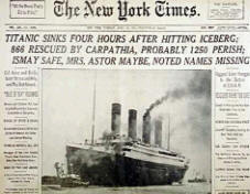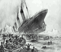 Titanic Disaster, one of the worst maritime disasters in history. The British luxury liner Titanic (46,000 gross tons) of the White Star Line, on its maiden voyage from Southampton to New York City, struck an iceberg about 153 km (about 95 mi) south of the Grand Banks of Newfoundland just before midnight on April 14, 1912. Of the more than 2220 persons aboard, about 1513 died, including the American millionaires John Jacob Astor, Benjamin Guggenheim, and Isidor Straus.